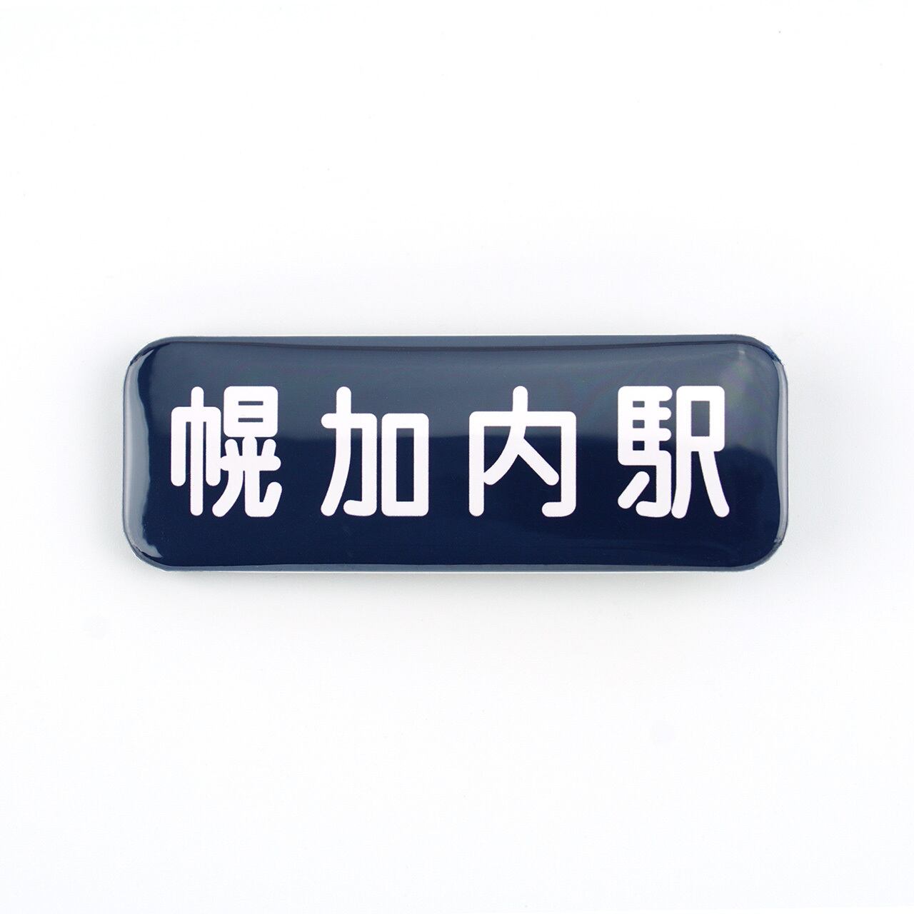 旧深名線幌加内駅の駅名看板の細長い缶バッジです。